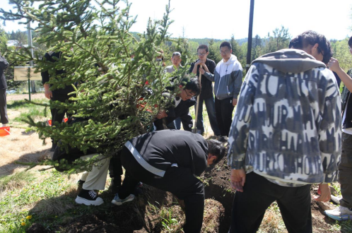 在镜池边,林场工作人员在预先选定好的植树地点指导学生们分工协作,刨土栽树。大家有的下苗扶正,有的培土踩实,有的挑水浇灌,植树现场呈现出一派热火朝天的劳动场面。