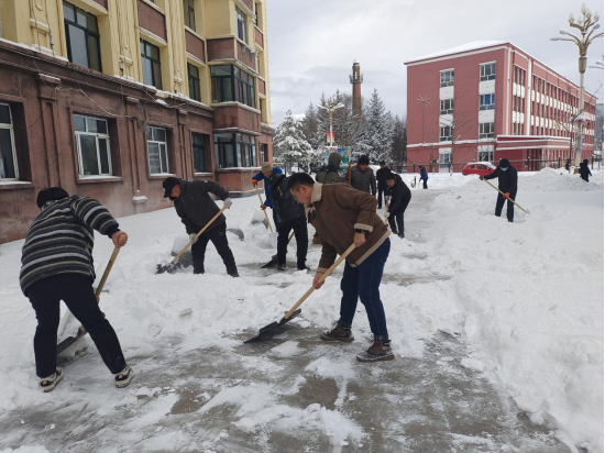 面对暴雪影响,林场干部职工自发清扫山下办公楼前及家属区院内积雪。