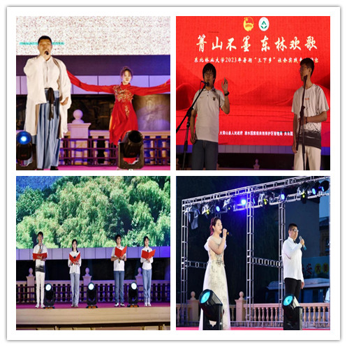 19时,在基荣广场近千名群众的期待下,一段绿意正浓、欢快愉悦的舞蹈《绿色的欢腾》拉开演出帷幕。青春接力唱《燕归巢》《如愿》《天后》《大鱼》《稻香》《失恋阵线联盟》《赤伶》等歌曲生动展现了东林学子朝气蓬勃、昂扬向上的青春模样。旋律悠扬、情感深邃的提琴重奏《花儿为什么这样红》让我们深切感受到了塔吉克族人民的忠贞品质和纯朴情怀。根据徐秀娟烈士英雄事迹改编而成的短剧《选择》,以“时空对话”的方式生动讲述了中国首位环保烈士、我校校友徐秀娟为养鹤事业奋斗、奉献的壮美故事。独舞《椿》表演者以自信、曼妙的舞姿,鲜活表达了人类对生命、对大自然的敬畏之意和爱护之情。幽默风趣、包袱不断的相声《智取威虎山》,引得观众掌声连连、喝彩不已。声情并茂、催人奋进的配乐诗朗诵《追寻》,将东林人团结拼搏、艰苦创业的宝贵精神品质展现的淋漓尽致。音调和谐、温情有爱的合唱《雪花的快乐》,为大箐山县人民送上了真挚祝福。最后,全体演员在茂盛的森林中高声唱响东林人心中的歌《前进,东北林业大学》。