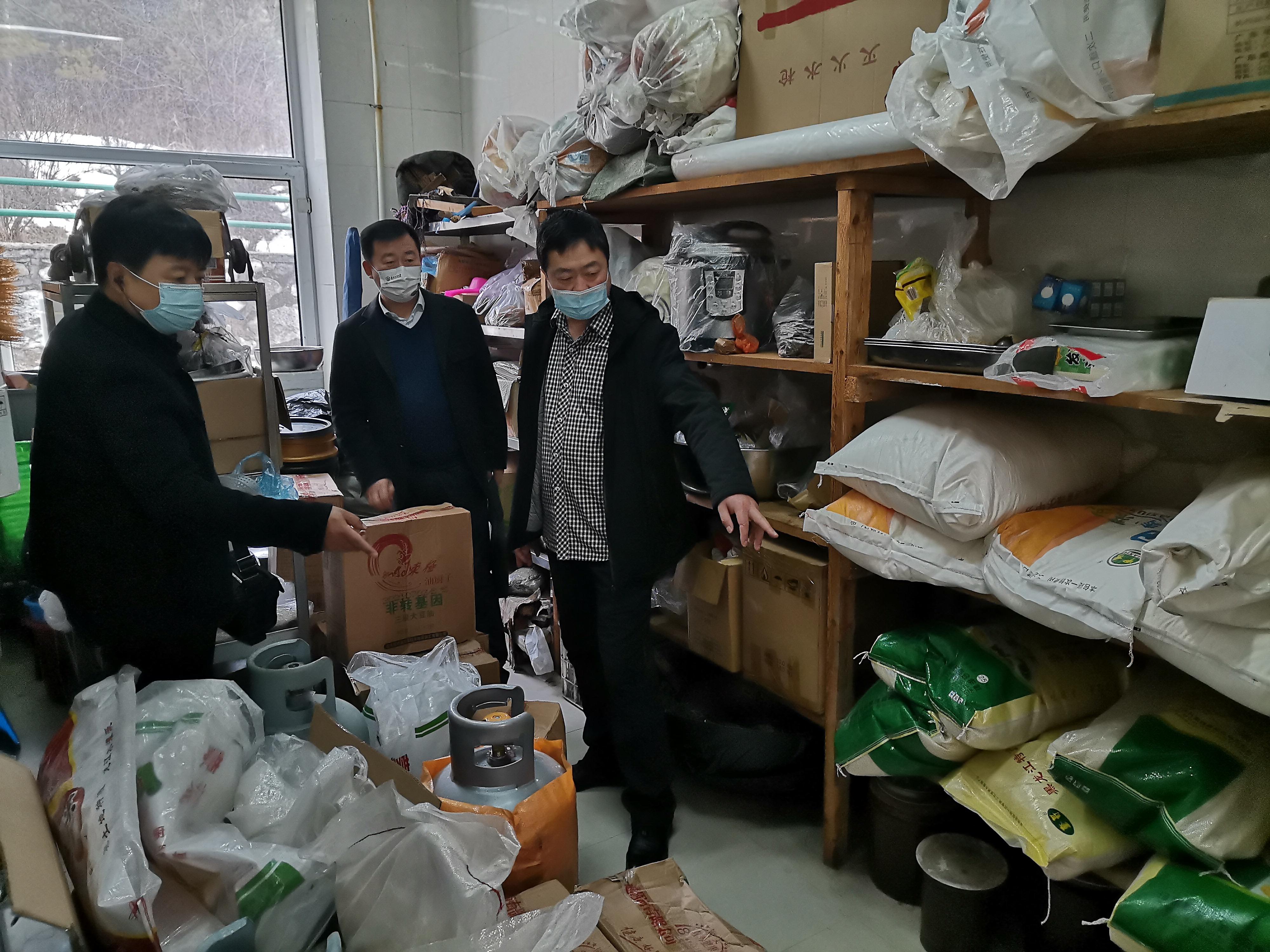 疫情防控领导小组首先检查了职工食堂、公寓、值班室、交通工具等日常消杀情况,对食用物资储备情况进行了实地探查,检查了教师公寓隔离房间,随后检查了防疫物资储备情况。