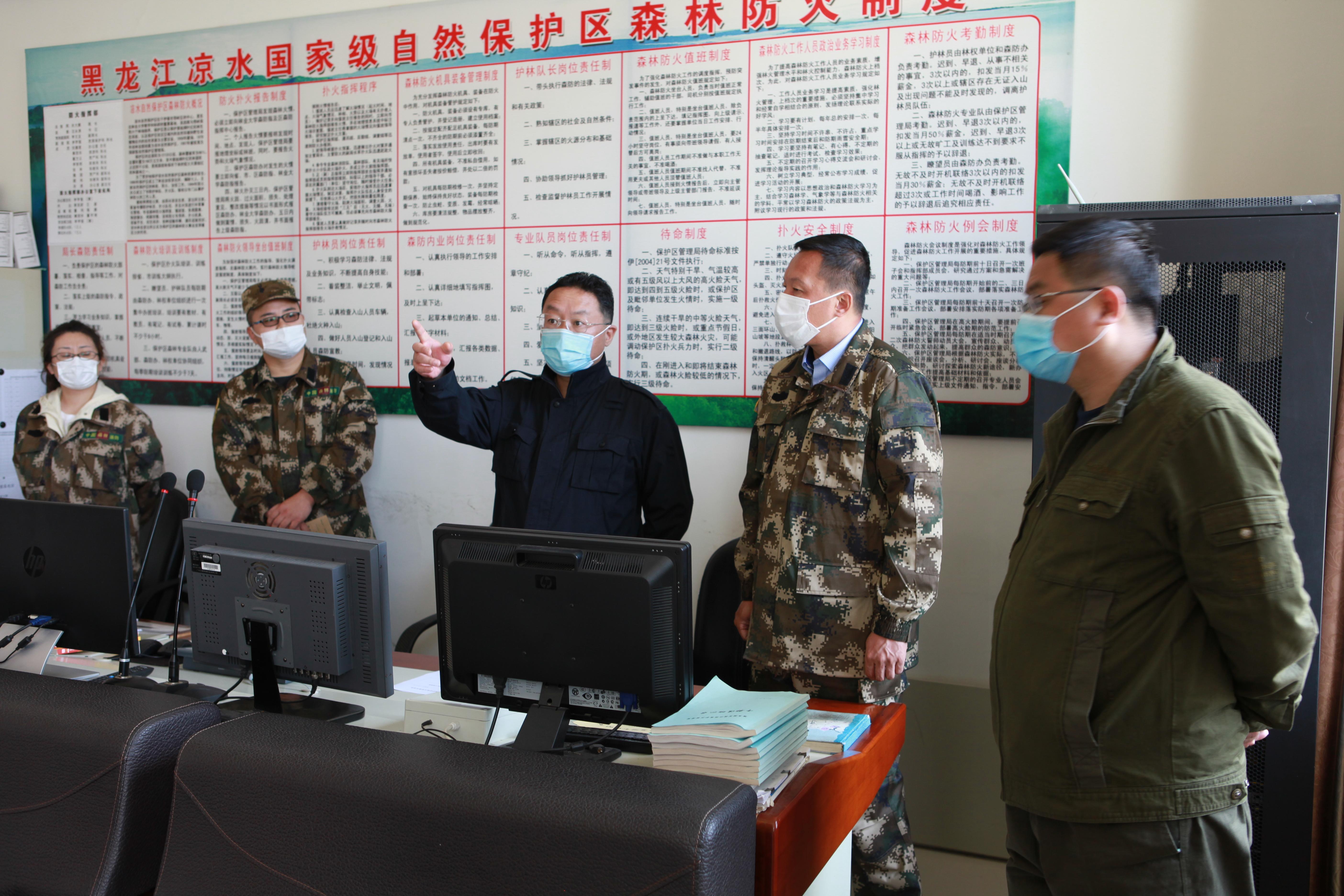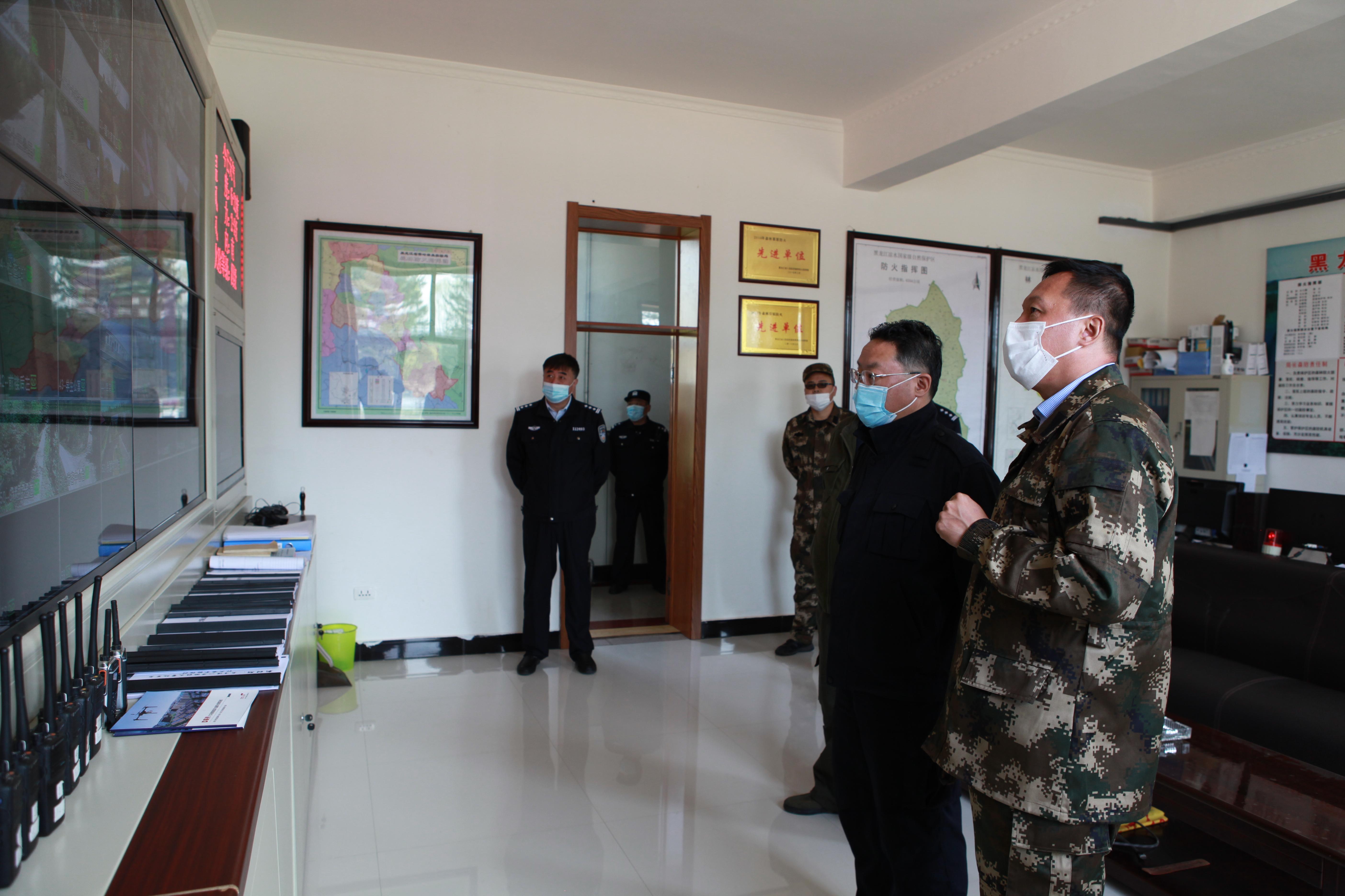 蒋建国副市长一行首先对检查站入区人员管控及火源管理工作进行了检查指导。在林政防火指挥中心,认真听取保护区春季森林防火及其它工作开展情况报告,详细了解了保护区林政防火视频监控系统建设运行情况,对系统功能拓展和警务科技融合提出指导意见。蒋建国副市长充分肯定了保护区人员管控及森林防火各项工作,同时强调,凉水国家级自然保护区生态区位独特,分布有大面积的珍贵原始红松林资源,具有重要的科学研究和极大的生态保护价值,当前正处于新冠肺炎疫情防控常态化阶段,疫情防控和森林防火都要坚持预防为主的方针,要始终高度重视人员管控和火源管理,严格落实防火责任,持续做好森防各项工作,确保生态系统得到切实有效的保护。