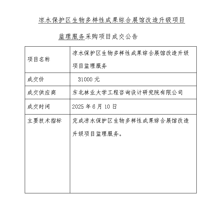凉水保护区生物多样性成果综合展馆改造升级项目监理服务采购项目成交公告