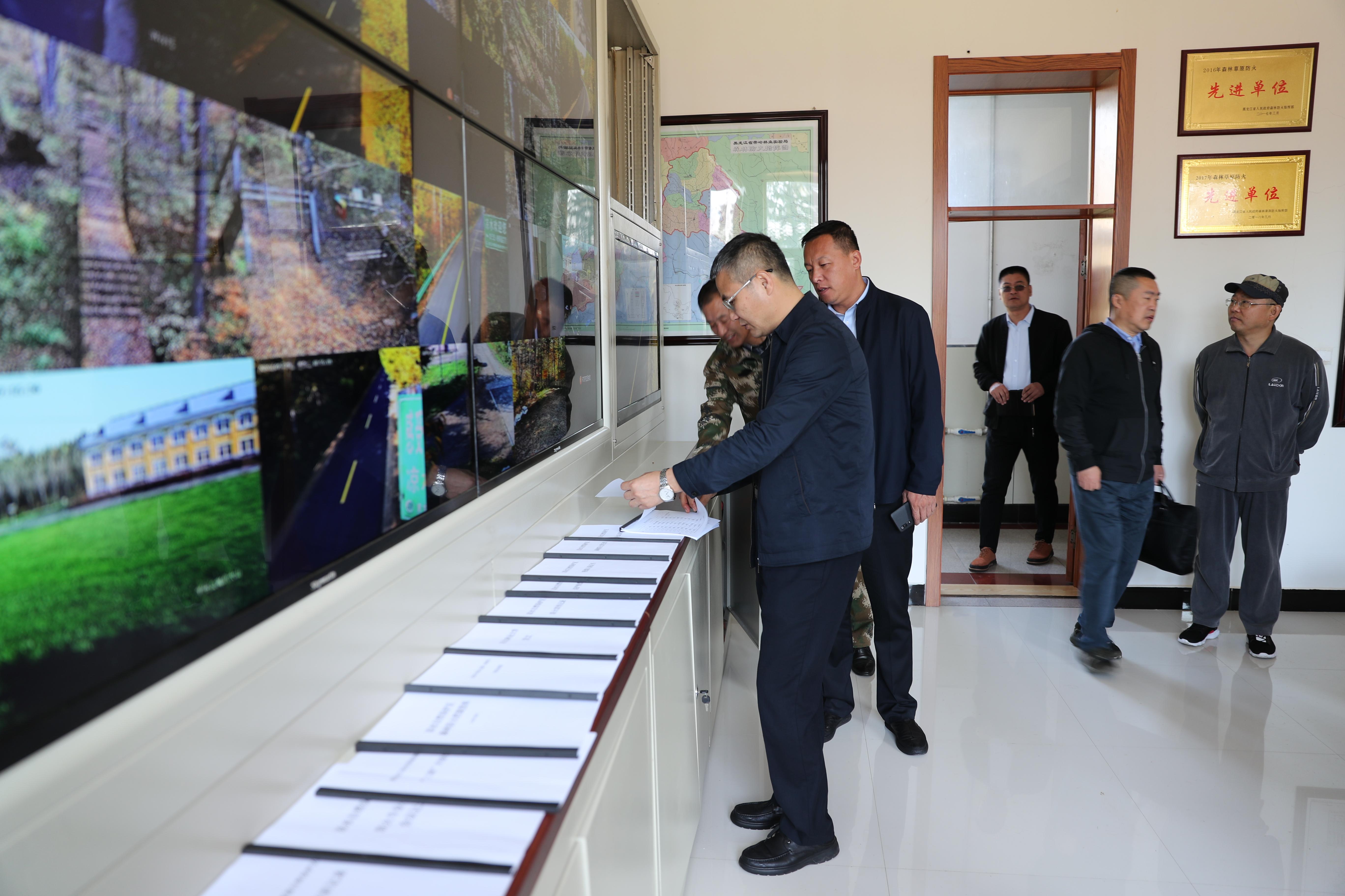 在林场林政防火指挥中心,关大鹏场长向校领导介绍了林场视频监控系统建设历程及现状。雒文虎副校长肯定了林场在技防方面的投入及做法,要求林场进一步做好规划,加大技防投入,用高科技手段增强林场防灭火能力。