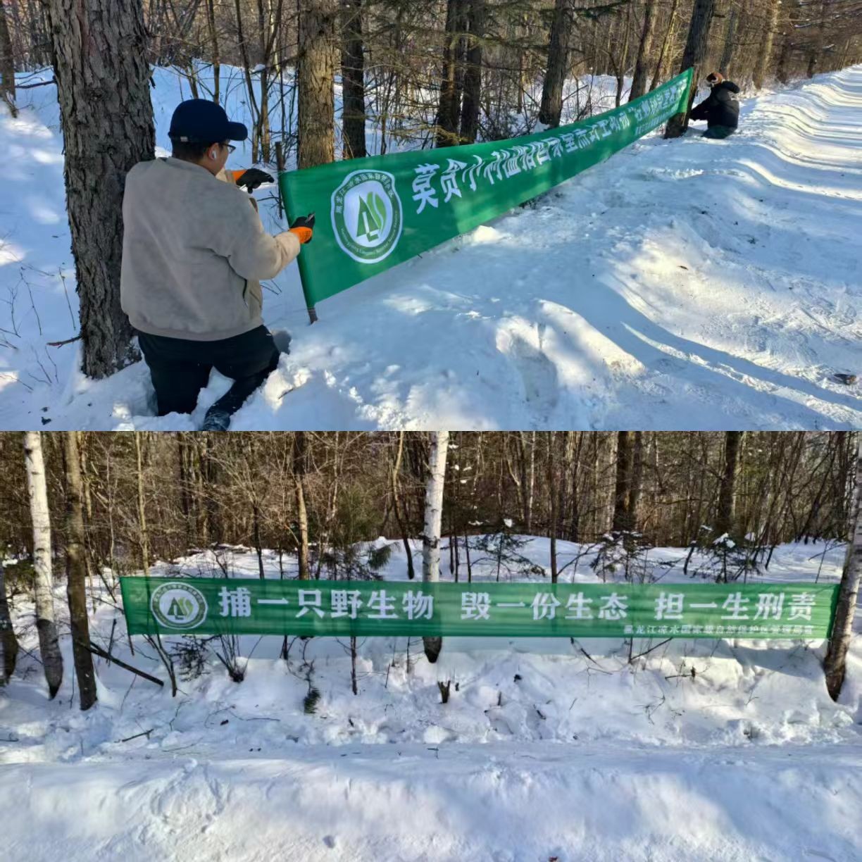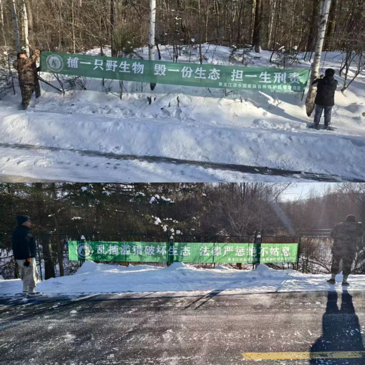活动过程中,在大箐山县带岭镇,保护区出动宣传车在城区主要路段,通过车载广播循环播放《中华人民共和国野生动物保护法》,护林宣传队员在集市等人流密集区域向过往群众发放宣传册,并主动进入特产店等个体商户,面对面向镇内群众普及野生动物保护法律常识;在保护区周边林场,护林宣传队员深入留守住户,在发放宣传册的同时积极宣讲开展此次专项行动的重要意义,告知住户不要触碰法律红线,严禁设置猎套、猎夹、猎网等捕猎工具,并鼓励其主动提供举报线索;护林宣传队员克服积雪没膝、天冷路滑等困难,在辖区乌带公路沿线主要入山路口、检查站、周边林场交界处等关键部位悬挂宣传警示条幅,进一步营造了浓厚的宣传警示氛围。活动期间,共播放车载宣传广播50余次,发放宣传册120余份,悬挂宣传警示条幅12条,有效提升了群众的法律意识和野生动物保护参与度,对企图捕猎设套的不法分子形成了有力震慑。
