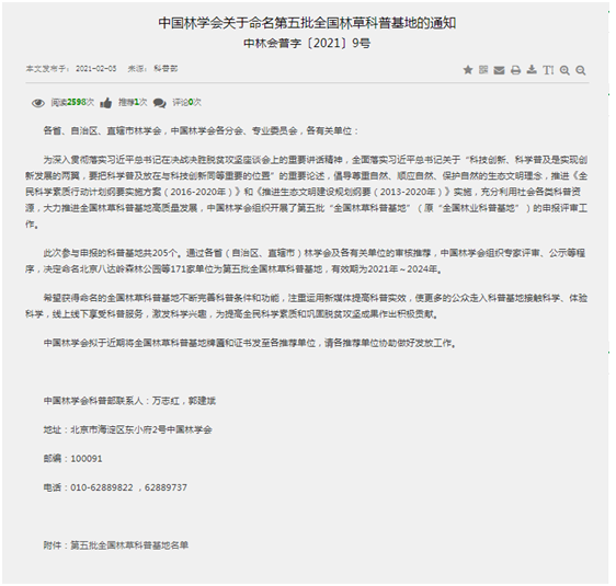 为深入贯彻落实习近平总书记在决战决胜脱贫攻坚座谈会上的重要讲话精神,全面落实习近平总书记关于“科技创新、科学普及是实现创新发展的两翼,要把科学普及放在与科技创新同等重要的位置”的重要论述,倡导尊重自然、顺应自然、保护自然的生态文明理念,推进《全民科学素质行动计划纲要实施方案(2016-2020年)》和《推进生态文明建设规划纲要(2013-2020年)》实施,充分利用社会各类科普资源,大力推进全国林草科普基地高质量发展,中国林学会组织开展了第五批“全国林草科普基地”(原“全国林业科普基地”)的申报评审工作。通过各省(自治区、直辖市)林学会及各有关单位的审核推荐,中国林学会组织专家评审、公示等程序,此次共命名171家单位为第五批全国林草科普基地,有效期为2021年~2024年。