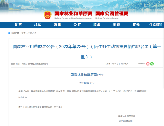 我国发布的首批789处陆生野生动物重要栖息地名录,保护了82.36%的国家重点保护陆生野生动物种类。根据我国陆生野生动物物种的重要性、种群数量和栖息地区位重要性、特殊代表性等,首批陆生野生动物重要栖息地共分为珍贵濒危物种生存繁衍区域、野生动物集群分布区域等六类,涉及31个省、区、市,覆盖了565种国家一、二级重点保护野生动物的栖息地、繁衍地、迁飞地。